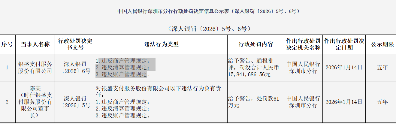 支付行业迎来新年首张千万级罚单。据中国人民银行深圳市分行行政处罚决定信息公示表显示,银盛支付服务股份有限公司(以下简称“银盛支付”)因“违反商户管理规定、违反清算管理规定、违反账户管理规定”,被处以警告、通报批评,同时罚没合计人民币约为1584.17万元。与此同时,时任银盛支付董事长陈某因对上述违法行为负有责任,被给予警告处分并处罚款61万元。