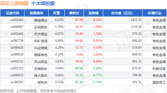 证券之星消息,1月20日,深证上游(399704)指数报收于7593.45点,涨0.21%,成交765.82亿元,换手率3.78%。当日该指数成份股中,上涨的有26家,湖南白银以10.03%的涨幅领涨,下跌的有22家,国际复材以7.95%的跌幅领跌。