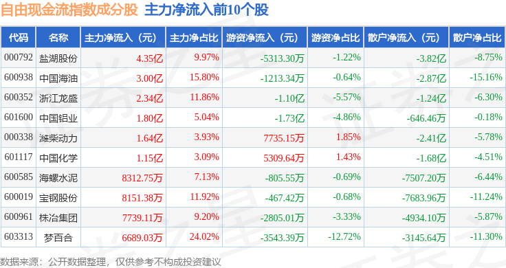 资金流向方面,自由现金流(980092)指数成份股当日主力资金净流入合计3.76亿元,游资资金净流出合计9903.41万元,散户资金净流出合计2.77亿元。成份股资金流向详情见下表: