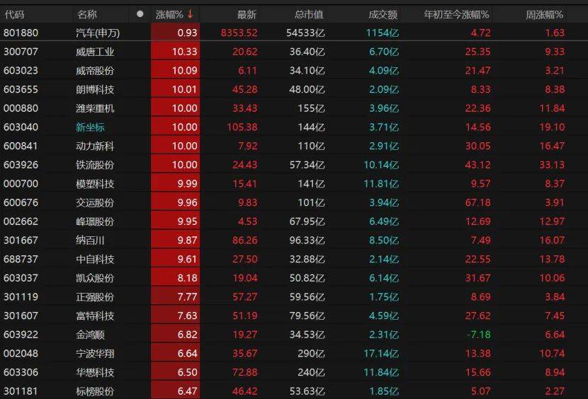 威帝股份、朗博科技、潍柴重机、新坐标、动力新科等9只汽车股涨停。