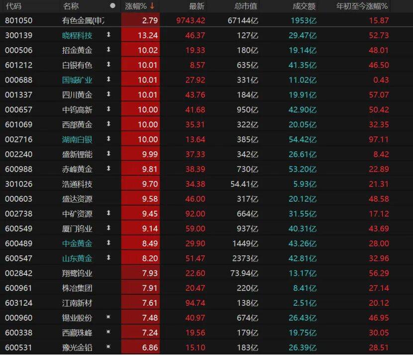 有色金属板块领涨,8只个股涨停,晓程科技涨逾13%,招金黄金、白银有色、国城矿业、四川黄金、中钨高新均涨停。