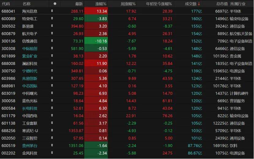 个股涨多跌少,3096只个股收涨,涨停股88只;2197只个股收跌,跌停股11只。18只个股日成交额超过100亿元,半导体个股海光信息、兆易创新、中芯国际、长电科技等大涨。电子设备制造个股澜起科技涨近12%,但信维通信跌逾10%。CPO(共封装光学)个股新易盛涨幅超3%,但中际旭创微跌。输变电设备个股特变电工跌近4%,但中国西电涨近3%。