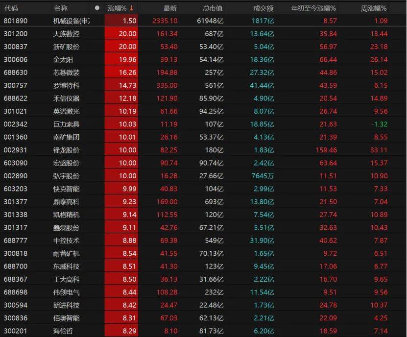 8只机械设备个股涨停,大族数控、浙矿股份、金太阳“20cm”涨停,英诺激光、禾信仪器、罗博特科涨势不错,巨力索具、南矿集团、锋龙股份、宏盛股份、弘宇股份均涨停。