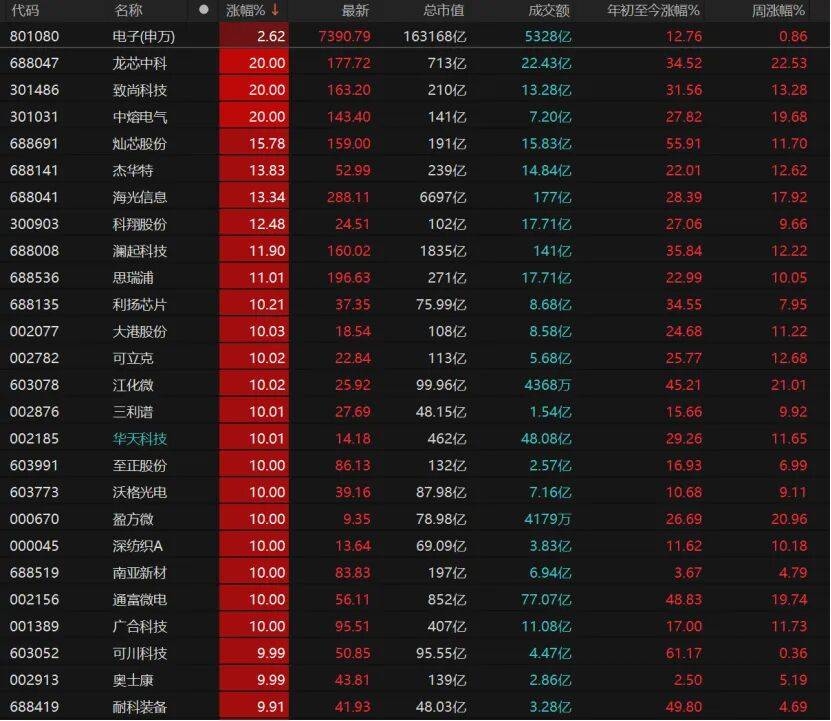 电子板块也大涨,17只相关个股涨停,龙芯中科、致尚科技、中熔电气“20cm”涨停,灿芯股份、杰华特、海光信息、科翔股份涨幅均超过10%,大港股份、可立克、江化微、三利谱、华天科技均涨停。