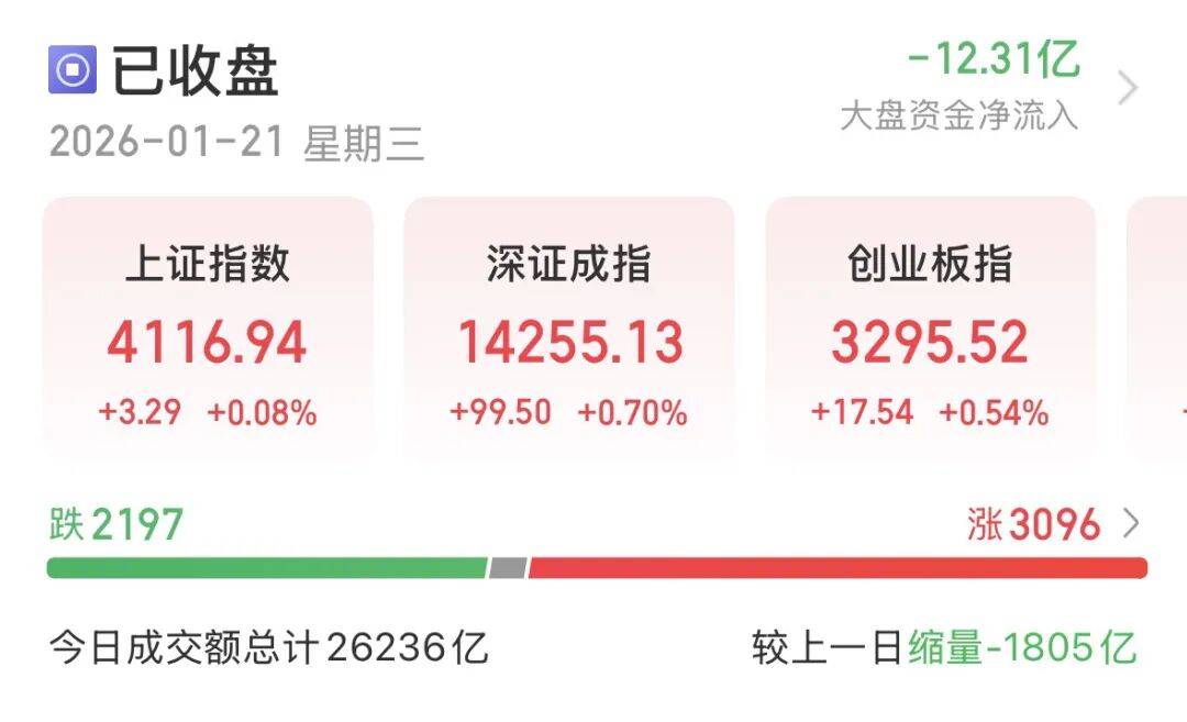A股继续震荡,观望情绪升温,量能一日缩减1804亿元,达2.62万亿元。沪指微涨0.08%报4116.94点,创业板指收涨0.54%报3295.52点,深证成指收涨0.7%。科创50收涨3.53%,沪深300、北证50微红,上证50微跌。