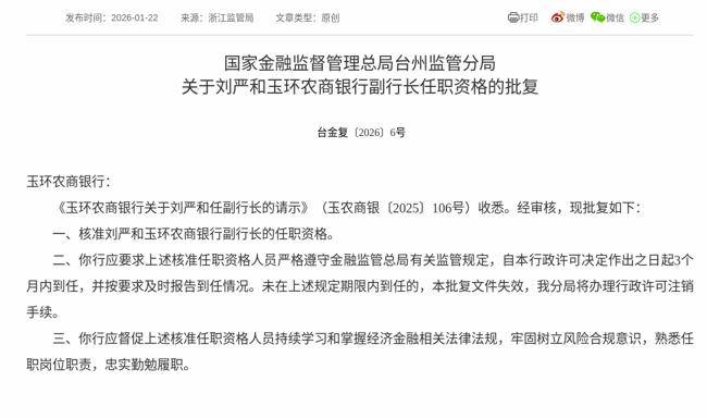 2026年1月22日,根据国家金融监督管理总局消息,《玉环农商银行关于刘严和任副行长的请示》获得通过,批复刘严和玉环农商银行副行长的任职资格。