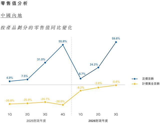 季内最引人注目的变化是产品结构的转变。周大福定价首饰的零售值贡献显著扩大至40.1%(2025财年第三季度为29.4%),而计价黄金首饰的贡献降至56.8%(2025财年第三季度为66.8%),有利于毛利率扩张。更值得关注的是平均售价的大幅提升。在内地市场,定价黄金首饰的平均售价从去年同期的5200港元猛增至9500港元,增幅高达82.7%。