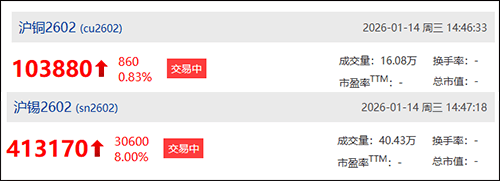 此外,截至北京时间14时46分,沪锡2602主力合约报价突破41万大关,续创历史新高,报413170元/吨,涨幅高达8.00%,沪铜2602主力合约亦稳步上扬,报103880元/吨,涨幅为0.83%