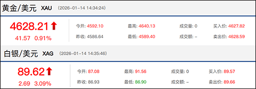 1月14日,贵金属集体拉升,截至北京时间14时30分左右,现货黄金涨0.91%,报4628.21美元/盎司,现货白银涨超3%,报89.62美元/盎司,盘中最高触及91.56美元/盎司,史上首次站上90美元关口。