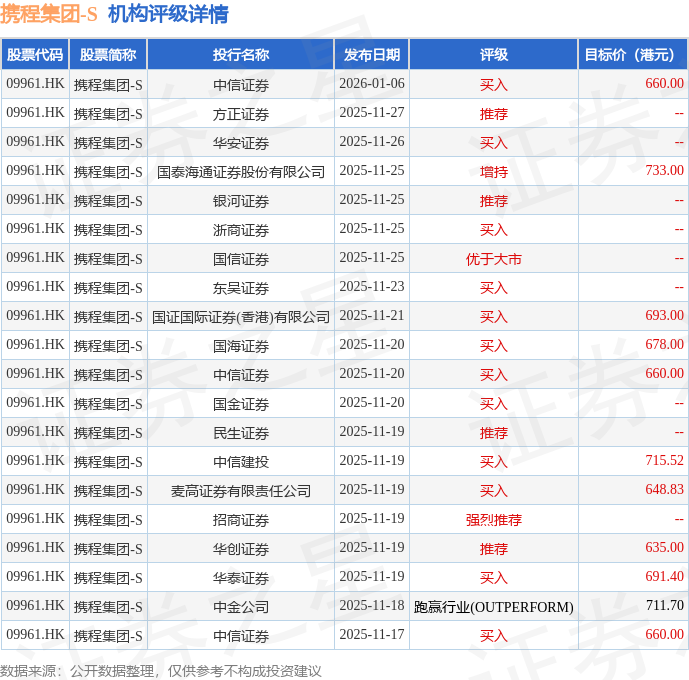 截至2026年1月14日收盘,携程集团-S(09961.HK)报收于569.5港元,下跌6.49%,成交量538.42万股,成交额31.15亿港元。投行对该股的评级以买入为主,近90天内共有12家投行给出买入评级,近90天的目标均价为680.59港元。中信证券最新一份研报给予携程集团-S买入评级,目标价660港元。