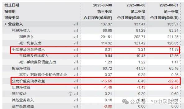 从单季度环比来看,2025年第三季度,上海银行的多个收入指标其实是明显下滑的。今年第一、第二、第三各单季度,手续费及佣金净收入分别为11.39亿、9.21亿、8.31亿;公允价值变动净收益分别为-22.48亿、6.49亿、-16.65亿。其中,公允价值变动净收益的剧烈波动,很大程度上正是与债券市场的剧烈波动同步,也凸显了过度依赖债券投资收益的风险。