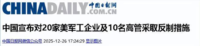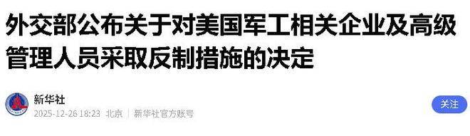 中国的反制行动并非空洞的口头威胁,而是实打实的行动。2025年12月26日,中国外交部发布公告,依据《中华人民共和国反外国制裁法》,正式对20家美军工企业及10名高管进行反制。这份名单由央视新闻公开,权威性毋庸置疑。