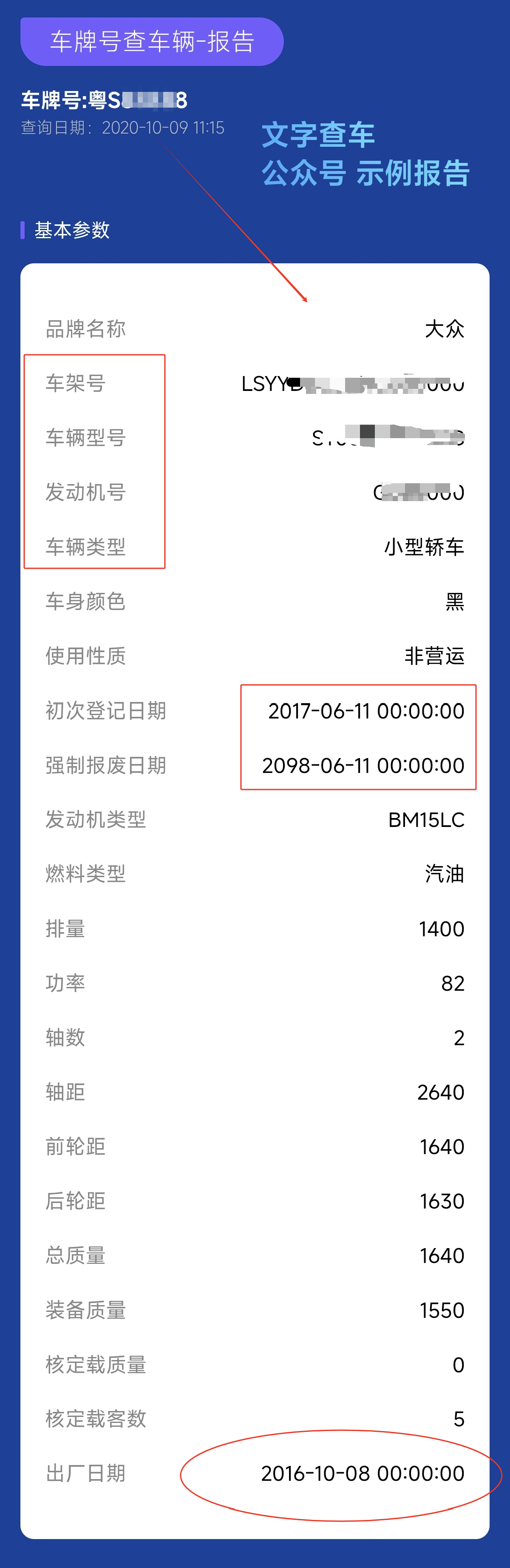 查询车辆的品牌车型、车架号、发动机号等完整信息,可按需选择线上线下渠道,线上优先推荐【文字查车】专业车况查询平台,省时高效。