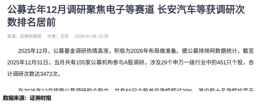 2025年12月的公募基金调研数据刚出来,我翻了翻——155家公募扎进451只个股,电子、机械设备行业成了“香饽饽”,华夏、博时、南方这些头部机构跑得最勤,连长安汽车都被调研了88次。星石投资说,接下来市场要从“靠流动性拔估值”转向“看业绩兑现”,高景气产业得找真能涨业绩的,传统行业看供需改善的。
