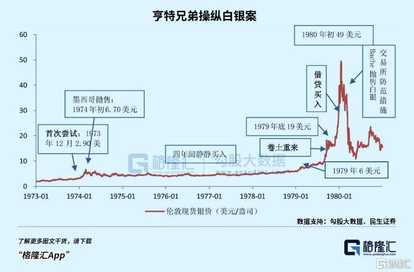 1973-1979年,美国亨特兄弟疯狂贷款抄底,共吃下2亿盎司白银,几乎掌握了整个市场的话语权。