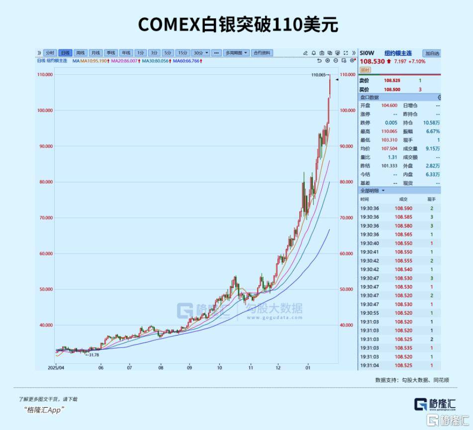 继周末破百后,今日白银价格继续疯涨,一度突破110美元/盎司。