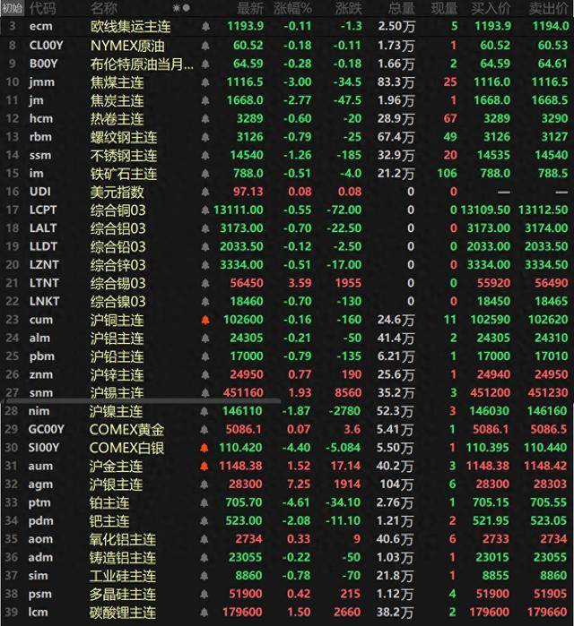 此外,碳酸锂主连涨1.5%,多晶硅主连涨0.42%,工业硅主连跌0.78%。欧线集运主连跌0.11%报1193.9。