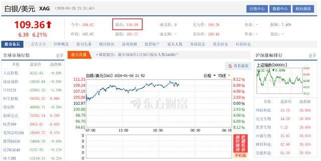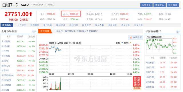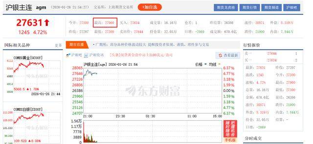 截至1月26日,全球贵金属市场呈现全面爆发态势,伦敦银(XAG)价格突破110美元/盎司,截至记者发稿,盘中涨幅达6.21%。国内市场上,白银T+D(AGTD)价格最高触及28093元/千克,截至记者发稿,盘中涨幅达2.95%。沪银主连(agm)价格最高触及27960元/千克,截至记者发稿,盘中涨幅达4.72%,创下阶段性新高。