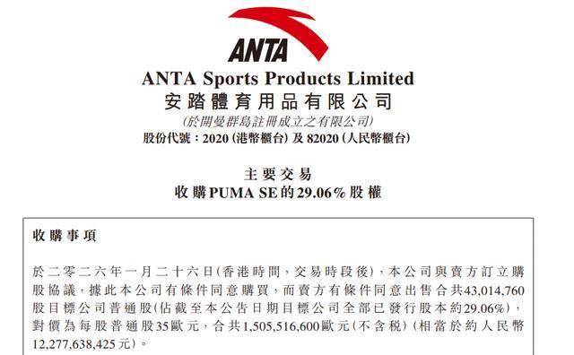 瑞财经 李兰1月27日,安踏体育(02020.HK)发布公告,其与Pinault家族的投资公司Groupe Artémis 达成购股协议,收购全球标志性运动品牌彪马(PUMA)所属公司PumaSE 29.06%的股权,现金对价为15亿欧元。