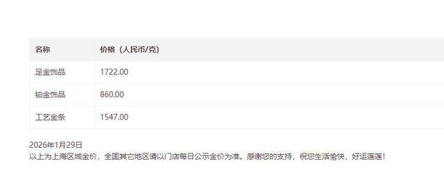 2026年1月29日9点40分,纽约黄金期货价格为5580.48美元/盎司,大涨约4.5%。国内黄金饰品价格也纷纷上调。周生生足金饰品克价从1614元上调到1708元,上调了94元。老庙黄金足金饰品克价从1612元上调到1722元,上调了110元。