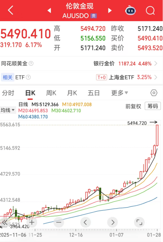 北京时间1月29日,现货黄金盘中首次突破5500美元/盎司大关,日内涨1.74%。现货白银向上触及118美元/盎司,创下历史新高,日内涨1.12%。