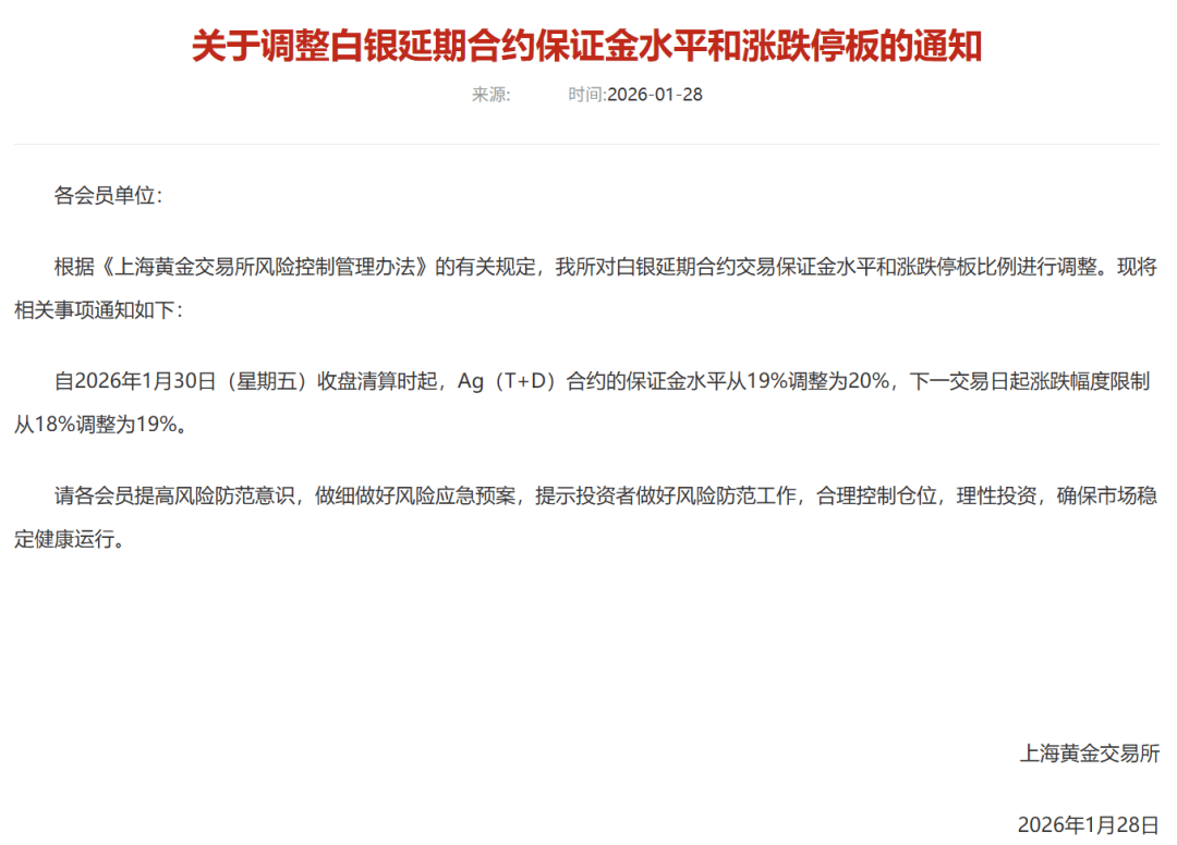 1月28日,上海黄金交易所发布通知,根据《上海黄金交易所风险控制管理办法》的有关规定,我所对白银延期合约交易保证金水平和涨跌停板比例进行调整。现将相关事项通知如下:自2026年1月30日(星期五)收盘清算时起,Ag(T+D)合约的保证金水平从19%调整为20%,下一交易日起涨跌幅度限制从18%调整为19%。
