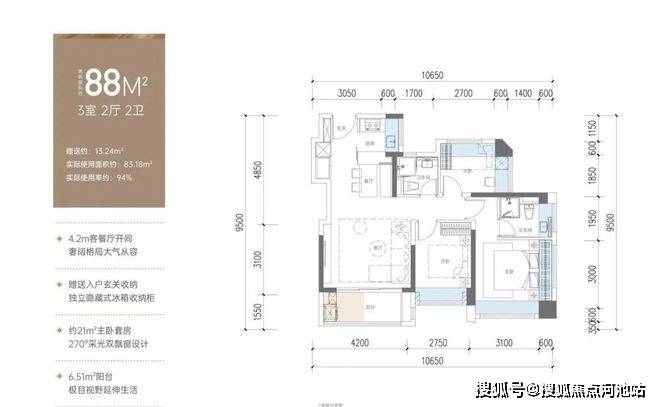 88㎡的3房2厅2卫,设计的是竖厅格局,进门独立玄关,LDKB一体化设计,客厅4.2米开间,S墙设计预留冰箱位,3个卧室分别做到了3.1米/2.75米/2.7米的宽度,U型厨房,得房率:94%(包含赠送),阳台有西南或东南朝向。