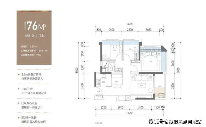 76㎡的3房2厅1卫,设计的是竖厅格局,进门独立玄关,LDKB一体化设计,客厅3.5米开间,S墙设计预留冰箱位,3个卧室分别做到了3米/2.9米/2.3米的宽度,U型厨房,得房率:91%(包含赠送),阳台有西南或东南朝向。