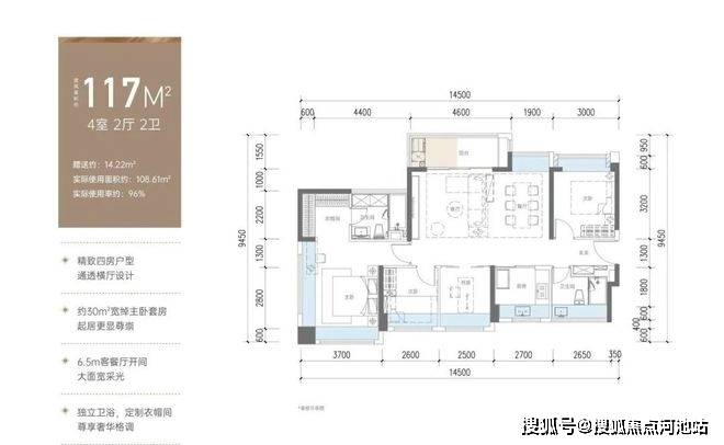 117㎡的4房2厅2卫,仅1栋A座01户型有,设计的是横厅南北通透格局,进门独立玄关,客餐厅6.5米开间,4个卧室分别做到了3.7米/2.7米/2.6米/2.5米的宽度,全屋飘窗,豪华主卧套间,U型厨房,得房率:99%(包含赠送),阳台主朝东北向。