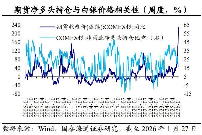 对标黄金:白银属性有何不同?回看历史,金、银价格的涨跌同步,但白银价格更具波动性。第一,白银的商品属性远强黄金,工业需求更为广泛。第二,白银的货币属性历史悠久但已显著弱化,且避险属性远不及黄金。在发生系统性风险、通胀高企、货币信用危机时,白银价格跟随黄金上涨,一旦危机缓解,该属性会迅速让位于商品属性。第三,白银的金融属性驱使价格更具弹性。由于单价低、波动大,白银容易吸引大量短线投机者和动量交易者,价格可能因投机炒作出现暴涨暴跌。