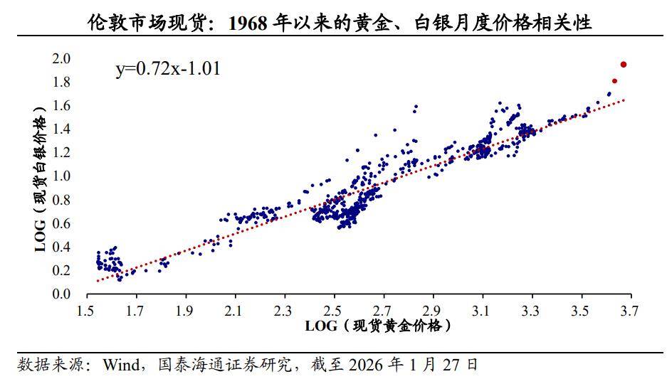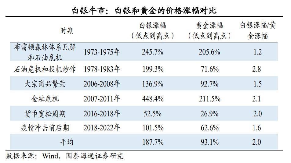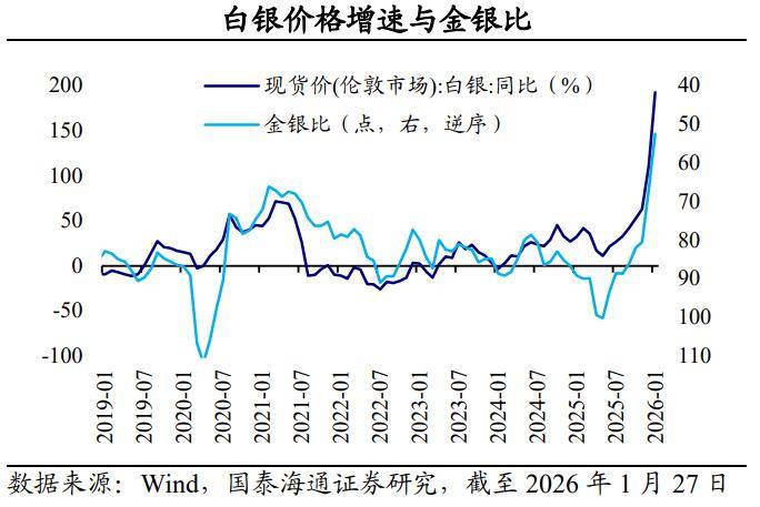 进一步,我们统计了数次白银牛市行情下的金银价格表现,平均来看,银价涨幅与金价涨幅的比值在1.2~2.8的范围区间。在本轮行情中,仅从2026年以来,这一比值已经达到2.8。