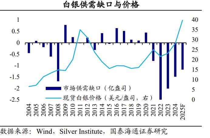 银价飙升:“工业和金融”需求共振。在中长期,白银的价格由商品属性主导,不过其供给弹性小,工业需求是核心。长期以来,白银价格与全球工业景气周期密切相关。当经济繁荣、工业生产扩张时,用银需求增加会提振银价。反之,用银需求萎缩会压制银价。过去几年,以光伏、新能源汽车、AI服务器为代表的新兴产业,创造了结构性的、持续增长的白银需求。全球白银供需的缺口在2020年显现,并持续到2025年,支撑银价上涨。