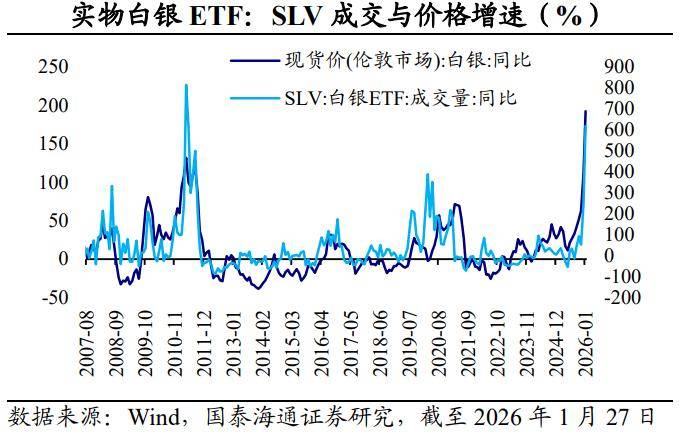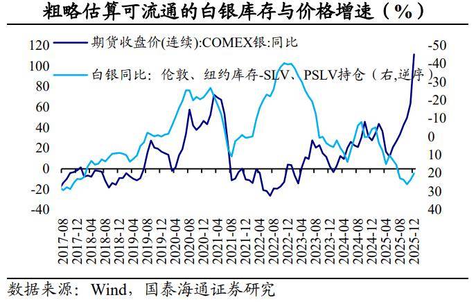 第二,部分白银ETF的锁仓机制会抬高“流动性溢价”。作为规模最大、流通性最强的白银ETF,iShares Silver Trust(SLV)属于实物支持型ETF,会将购入的白银存入托管库(如伦敦金库)并锁定,使其退出市场流通。如果ETF锁定库存的比例较高,会减少现货市场的即时供应,制造或加剧“逼仓”环境。通常,SLV的白银ETF成交量增速与白银价格增速走势较为一致。如果我们把伦敦、纽约的白银库存扣除SLV、SPLV等实物白银ETF持仓后,发现剩余白银库存的紧缺会推升白银价格。