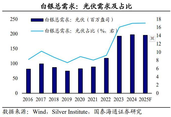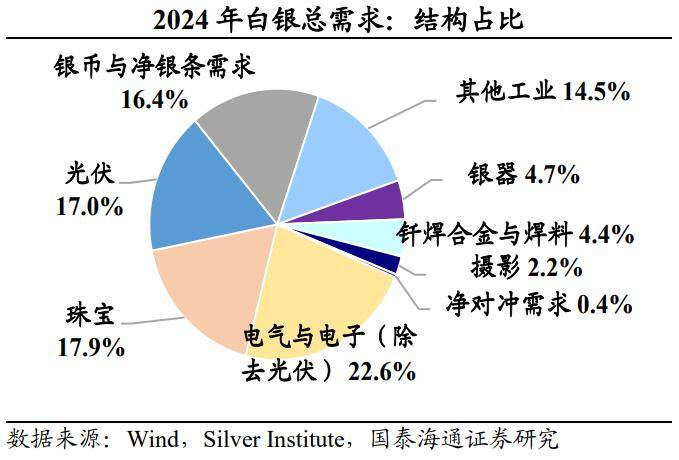 在需求侧,工业制造是白银的核心需求领域,2024年占据白银总需求的58.5%。其中,关键领域的用银增长值得关注。第一,在光伏新能源,对比2016-2022年和2023-2024年,光伏用银在白银总需求的占比由8.7%升至16.7%,主因太阳能电池板所需的导电银浆用量持续攀升。第二,在汽车工业,电动汽车的用银量普遍高于传统燃油车,加之车载电子系统日趋复杂,进一步增加了白银消耗。第三,电路板、开关触电等电子器件构成持续稳定的用银基础。科技迭代(如柔性电子,生物传感器)推动白银在高端电子领域的渗透。此外,化工催化剂、医疗器材及超导材料等高端工业领域也是白银需求的重要组成。