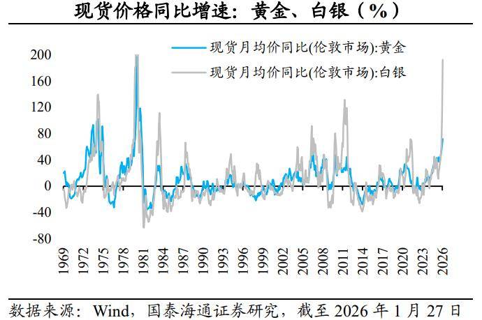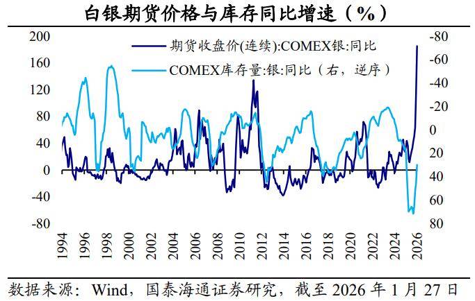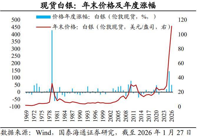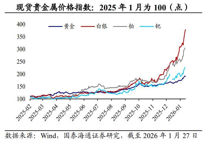 银价飙升创新高,领涨贵金属。2025年以来,黄金、白银、铂、钯等贵金属价格迎来超级周期。从伦敦现货看,2025年全年,每盎司白银价格从年初的29.4美元涨至72.0美元,涨幅高达144.8%,相比之下,黄金、铂、钯的全年涨幅分别为62.8%、141.7%、80.2%。值得关注的是,近两个月,白银价格涨势明显加速。截至2026年1月27日,每盎司现货白银、COMEX期货白银的价格分别达到111.6美元、106.5美元,均创下历史新高,开年涨幅分别达到50.3%、51.1%。