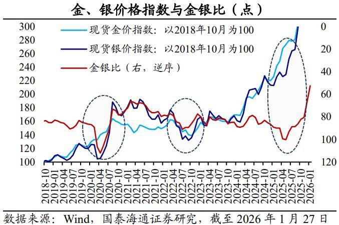 银价波动与金价高度相关,且弹性更高。回看历史,黄金、白银既是商品,又是货币,且都具备金融投资、避险属性,但是权重和表现方式有显著不同。所以,金、银价格的涨跌近乎同步,但白银价格更具波动性和复杂性。在黄金价格飙升、狂跌的时期,金银比往往反向运行,体现出白银价格弹性更大。
