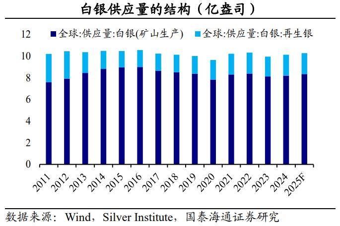 在中长期,白银的价格由商品属性主导,不过其供给弹性小,工业需求是核心。根据世界白银协会(Silver Institute)的披露,2024年,白银的年产量在10.2亿盎司左右,源于矿产和回收的比重分别为81%、19%。一方面,再生银的来源相对稳定。另一方面,对于矿产银,约30%来自独立银矿,超过70%是作为铜、铅、锌、金等基本金属开采的副产品。这意味着白银供应量与铜等主金属的矿业周期和投资密切相关,整体供给价格弹性较小。