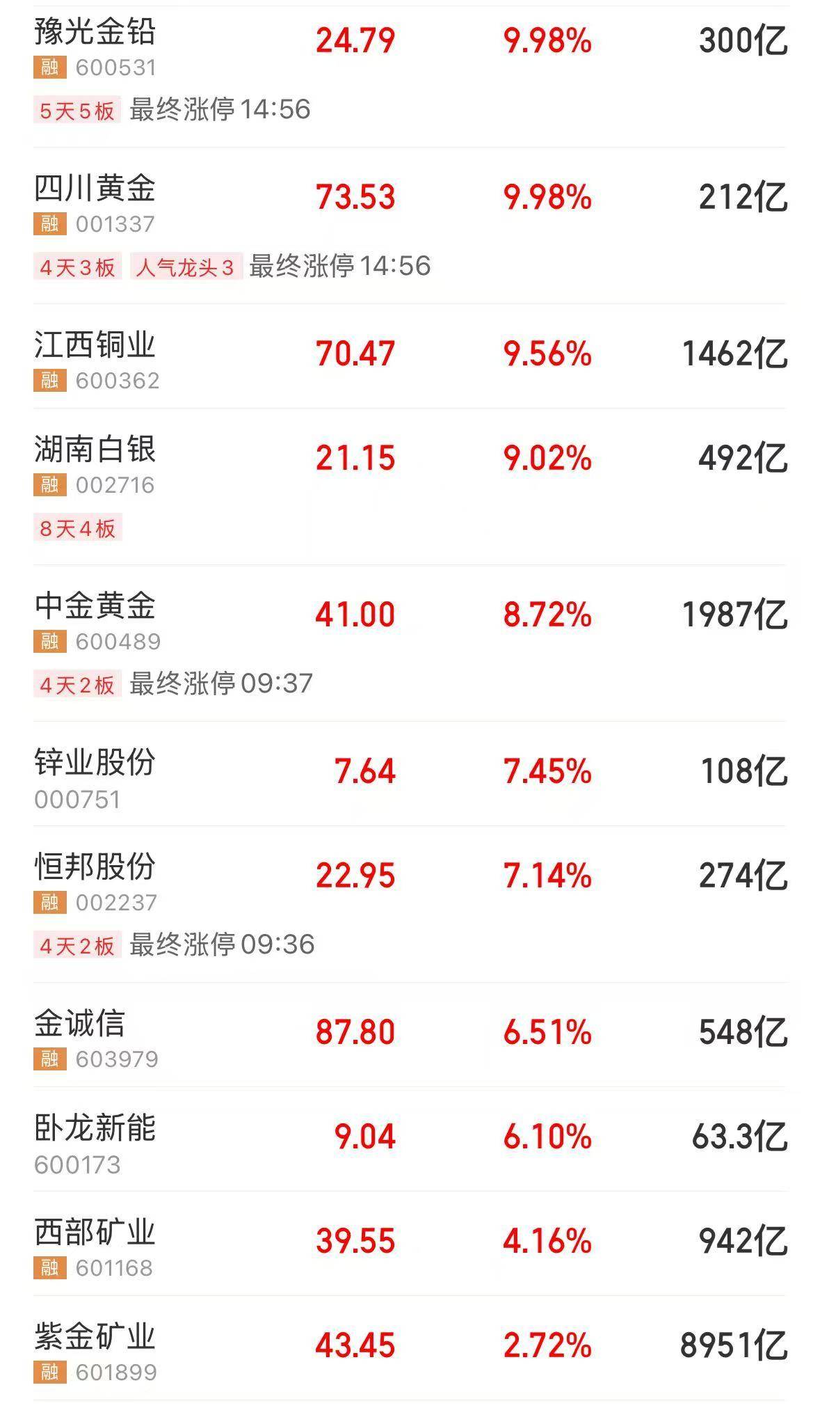 有色金属板块反复活跃,金属铜、贵金属领涨,西部黄金7天4板,中国黄金5连板,北方铜业2连板创历史新高。