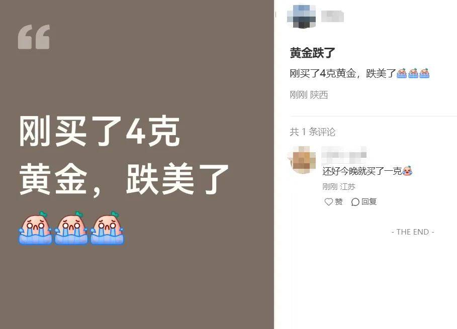 网友很不淡定:“刚买了4克黄金,跌没了”,“今天刚上车就1克,亏了一百多?”