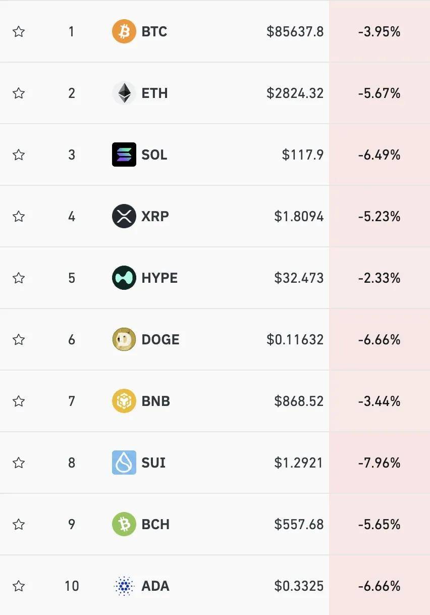 加密货币大跌,比特币价格跌超3.95%,跌破86000美元,以太坊跌5.67 %,狗狗币跌6.66%,近24小时爆仓人数超18万人。