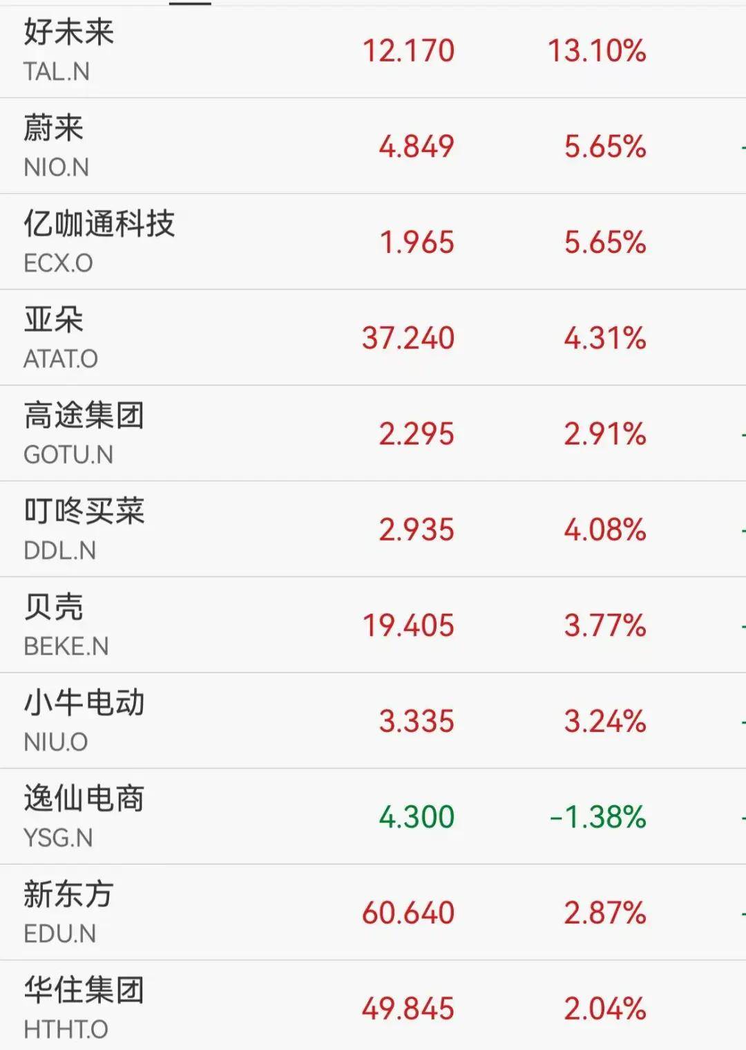 中概股涨跌不一,好未来涨超13%,其2026财年第三季度业绩超预期。蔚来涨超5%,亚朵、叮咚买菜涨超4%,阿里巴巴涨约1.5%。