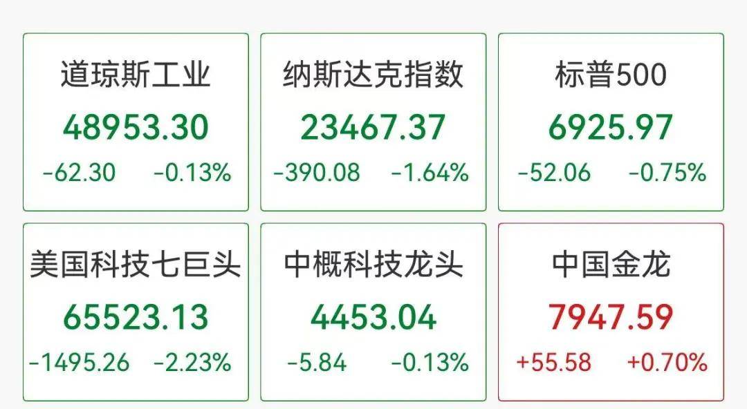 美股三大股指全部下跌,截至发稿,道琼斯指数跌0.13%,标普500指数跌0.75%,纳斯达克综合指数跌1.64%。