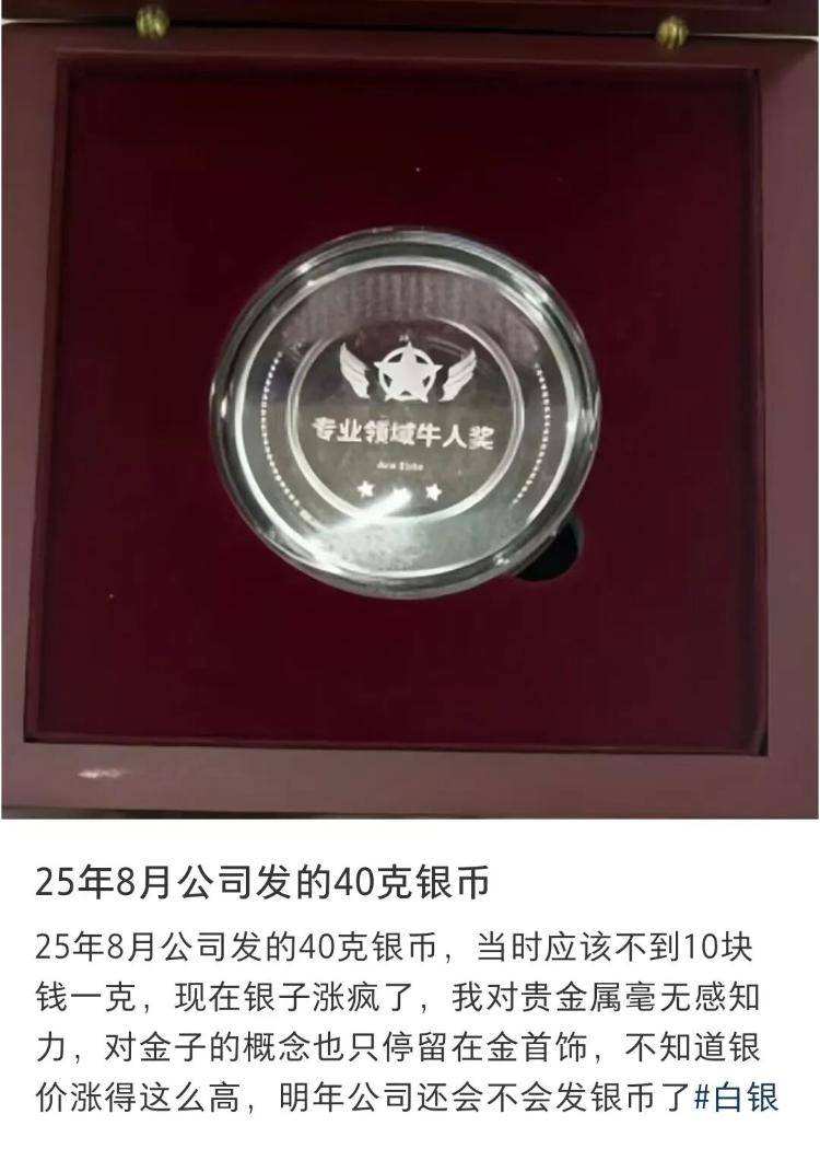 网友小星(化名)也在社交平台晒出去年8月公司作为员工奖励发放的40克银币,银币上写着“专业领域牛人奖”的字样,在当时估价约为320元。