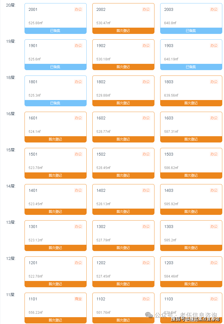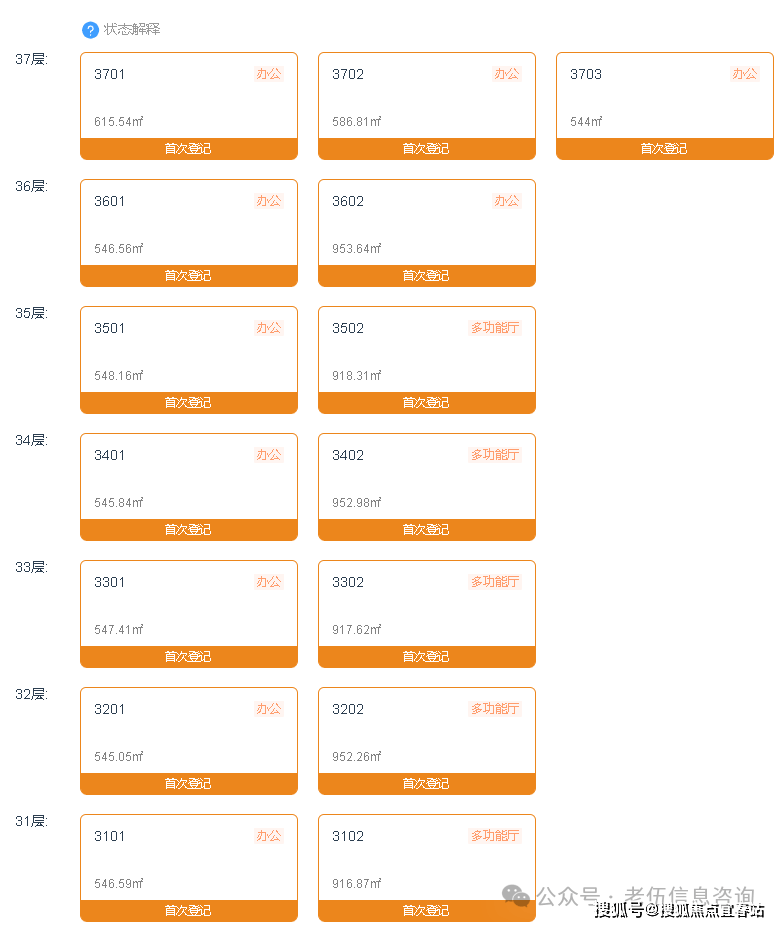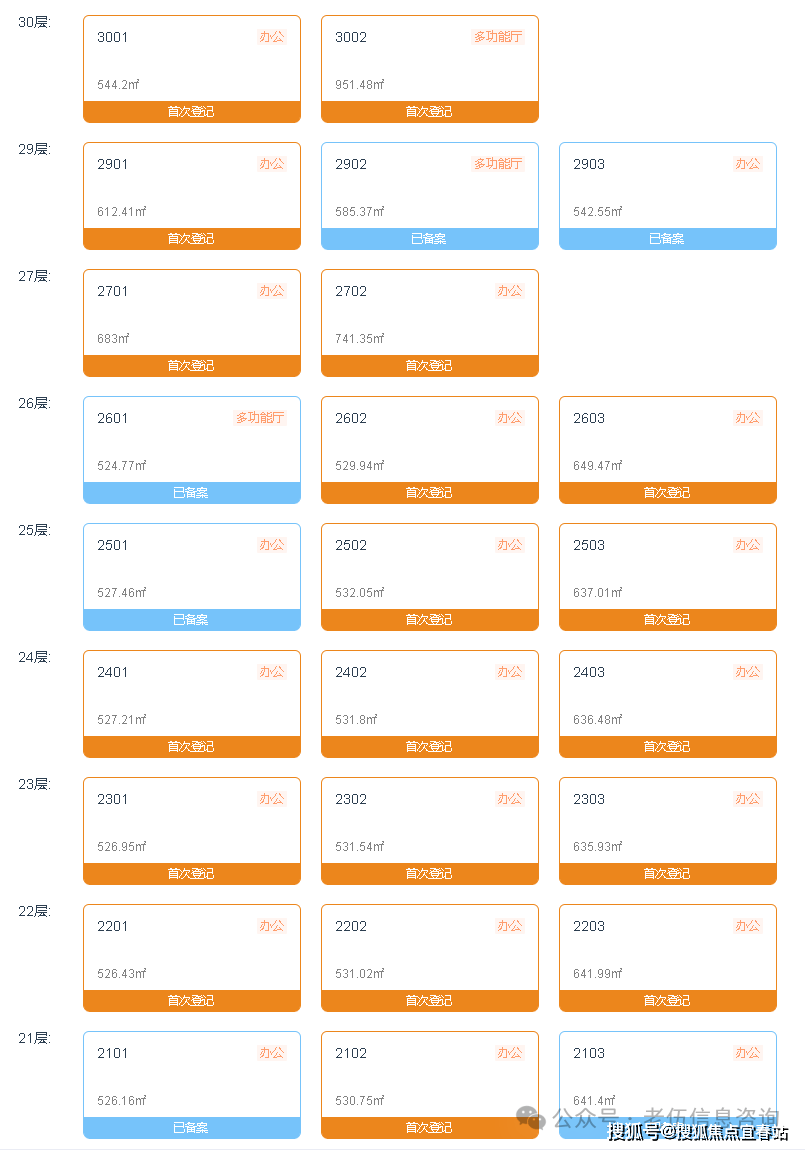 分布在11-36层。面积段为501.76-953.64㎡,备案均价约为8.5万/㎡,备案单价在7.39-10.36万/㎡之间,总价区间在3897.06-9534.97万。