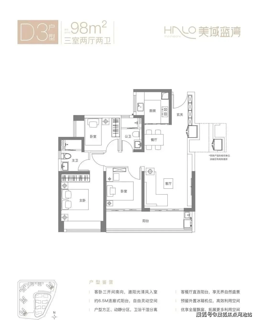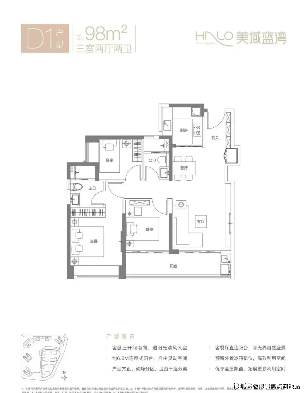 98㎡的3房2厅2卫,D1户型,经典竖厅格局,客厅3.7米开间,LDKB一体化设计,S墙设计预留冰箱卡槽位,动静分区,客厅连接次卧出6.5米长的大阳台,U型厨房,卫生间干湿分离,得房率约80.12%(不含赠送),西南或东北朝向。