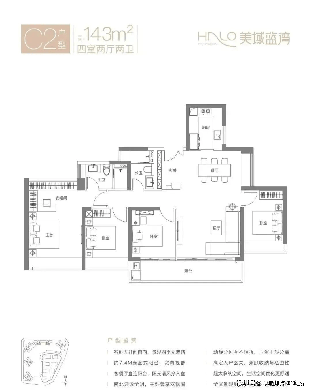 143㎡的4房2厅2卫,C2户型,竖厅双龙抱珠格局,客厅4.4米开间,LDKB一体化设计,五开间朝南,客厅连接次卧出7.4米长的巨幕大阳台,U型厨房,卫生间干湿分离,得房率约77.13%(不含赠送),正南朝向。