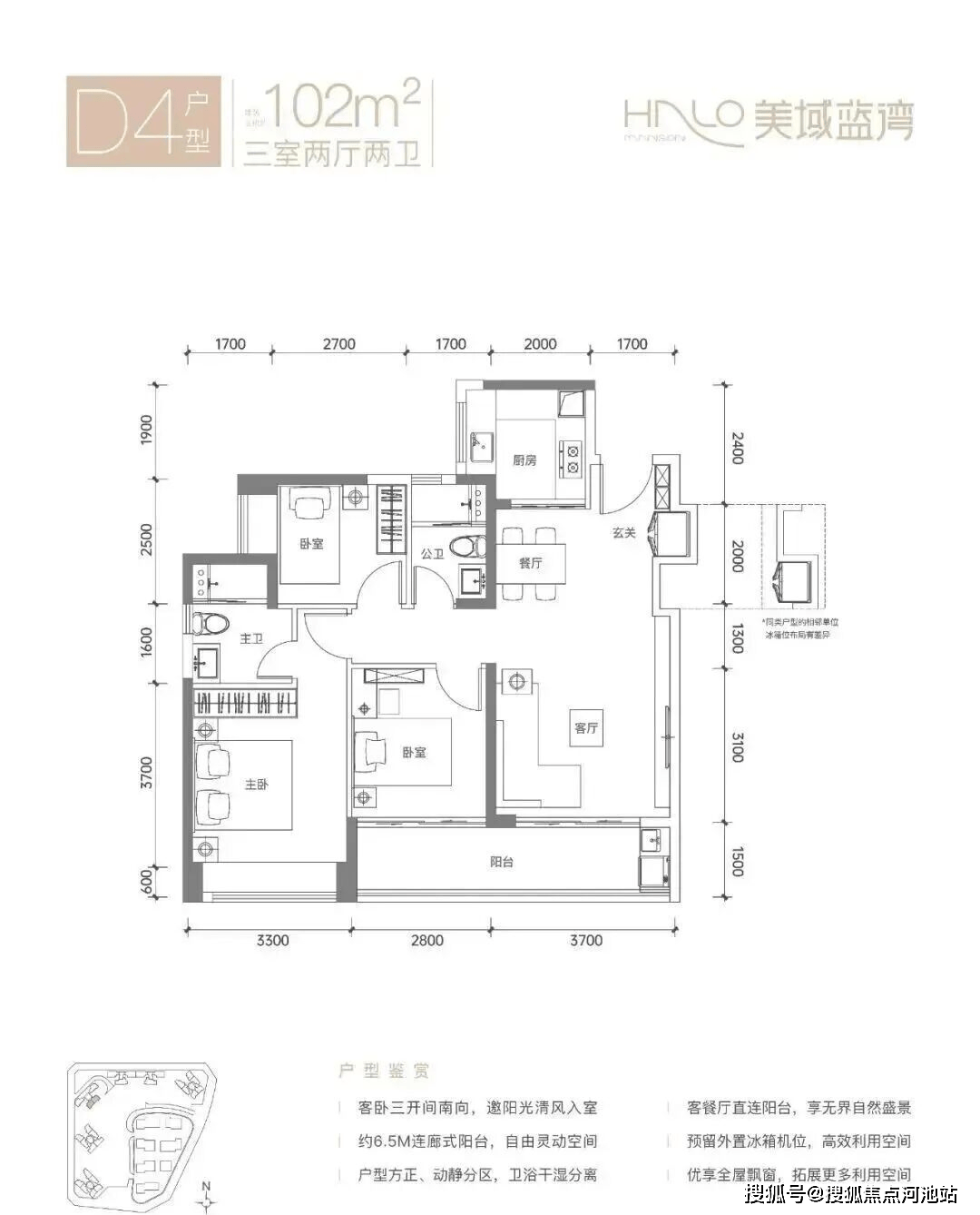 102㎡的3房2厅2卫,D4户型,经典竖厅格局,客厅3.7米开间,LDKB一体化设计,S墙设计预留冰箱卡槽位,U型厨房,卫生间干湿分离,三开间朝南,客厅连接次卧出6.4米长的观景大阳台约9.75m²,东南朝向看小区园林,得房率约75.3%(不含赠送),加上赠送得房率83.97%。