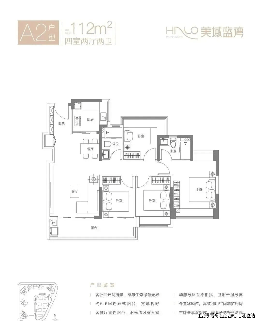 112㎡的4房2厅2卫,A2户型,竖厅南北通透格局,客厅3.9米开间,LDKB一体化设计,S墙设计预留冰箱卡槽位,动静分区,客厅连接次卧出6.5米长的大阳台,U型厨房,卫生间干湿分离,得房率约80.12%(不含赠送),西南或东北朝向。