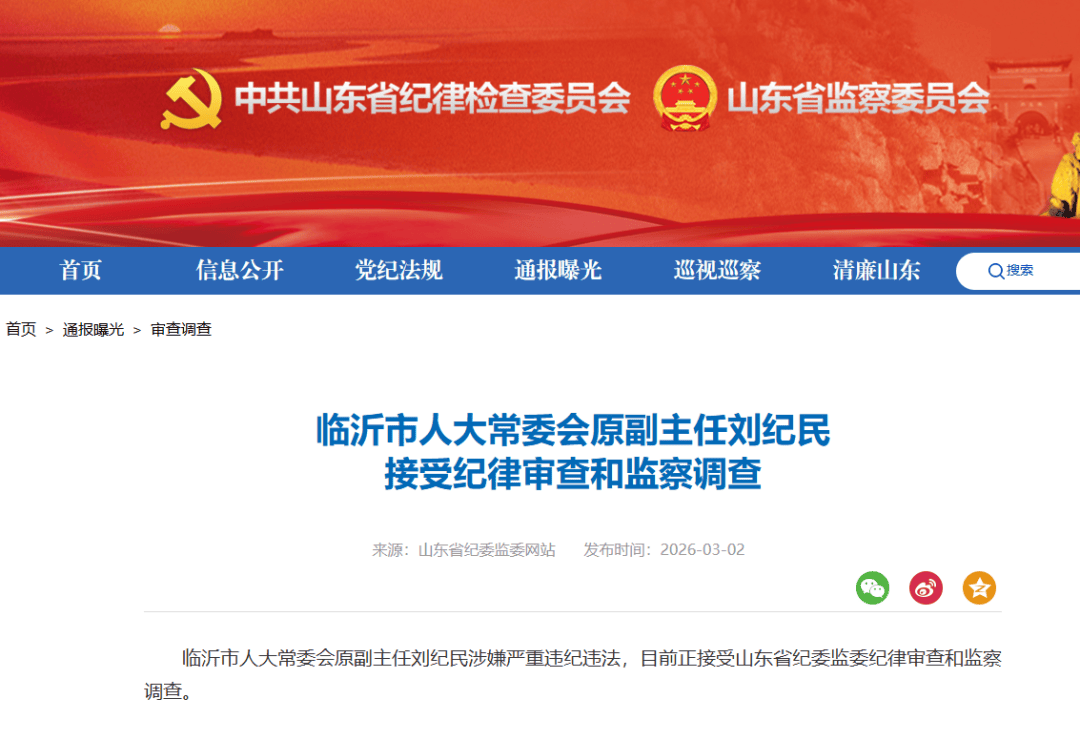 临沂市人大常委会原副主任刘纪民涉嫌严重违纪违法,目前正接受山东省纪委监委纪律审查和监察调查。
