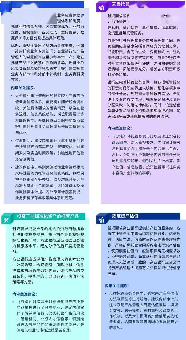 从管理框架来看,《办法》对比2022年12月29日发布的《商业银行托管业务监督管理办法(征求意见稿)》在结构上进行了优化调整,尤其在托管产品准入、非标资产托管、对垫资(主要针对快赎货币基金)的规定、信息系统要求以及风险资本计提上,《办法》提出了明确、系统化、精细化的要求。同时,《办法》还为存量业务提供了三年的过渡期。